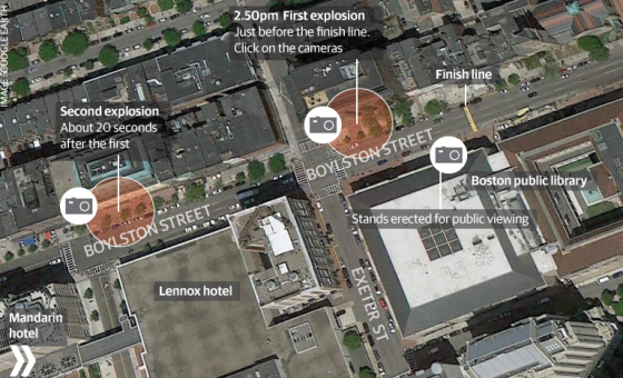 Britský server The Guardian použil Google Earth pro vytvoření interaktivní mapy při bombovém útoku na bostonském maratonu.
