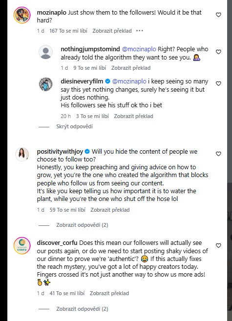 Celou situaci dokreslují desítky dotazů od instagramových tvůrců pod výše vloženým Mosseriho příspěvkem. Do jednoho se ptají na to, jestli Instagram zase začne zobrazovat obsah jejich sledujícím.