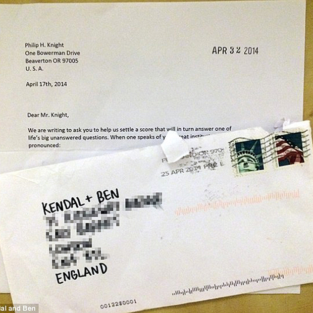K velkému překvapení jim přišla poštou odpověď. Z dvou nabízených variant výslovnosti Nike jako slovo bike (tedy "najk") nebo jako Ni-key ("naj-kí") zakroužkoval Knight jako správnou druhou variantu.