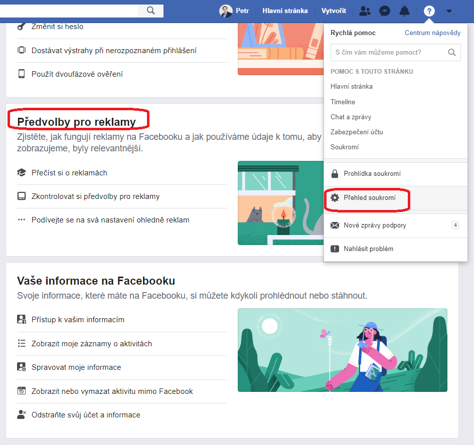Po kliknutí na symbol otazníku na liště se dostanete k „Přehledu soukromí“, v jehož rámci pak zaklikněte volbu „Předvolby reklamy“.