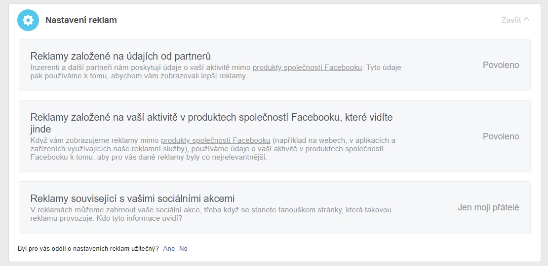 Neznamená to ale, že se k podobnému nastavení na Facebooku nedostanete. Dále si ukážeme nastavení reklam: třeba, jak se zbavit remarketingu nebo zjistit, zdali jste v nějaké „custom audience“ pro cílení reklam.