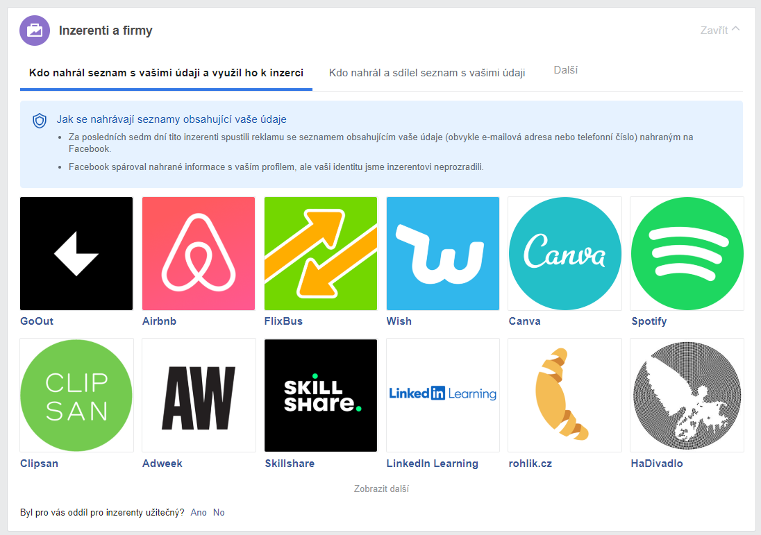 Druhá možnost přitom značí, že inzerent, co nahrál seznam s vašimi údaji, si vytvořil reklamní custom audience, obvykle na základě vaší e-mailové adresy nebo telefonního čísla. Facebook nicméně zobrazuje jen ty, co tak učinili v posledních 7 dnech, a to v sekci „Inzerenti a firmy".