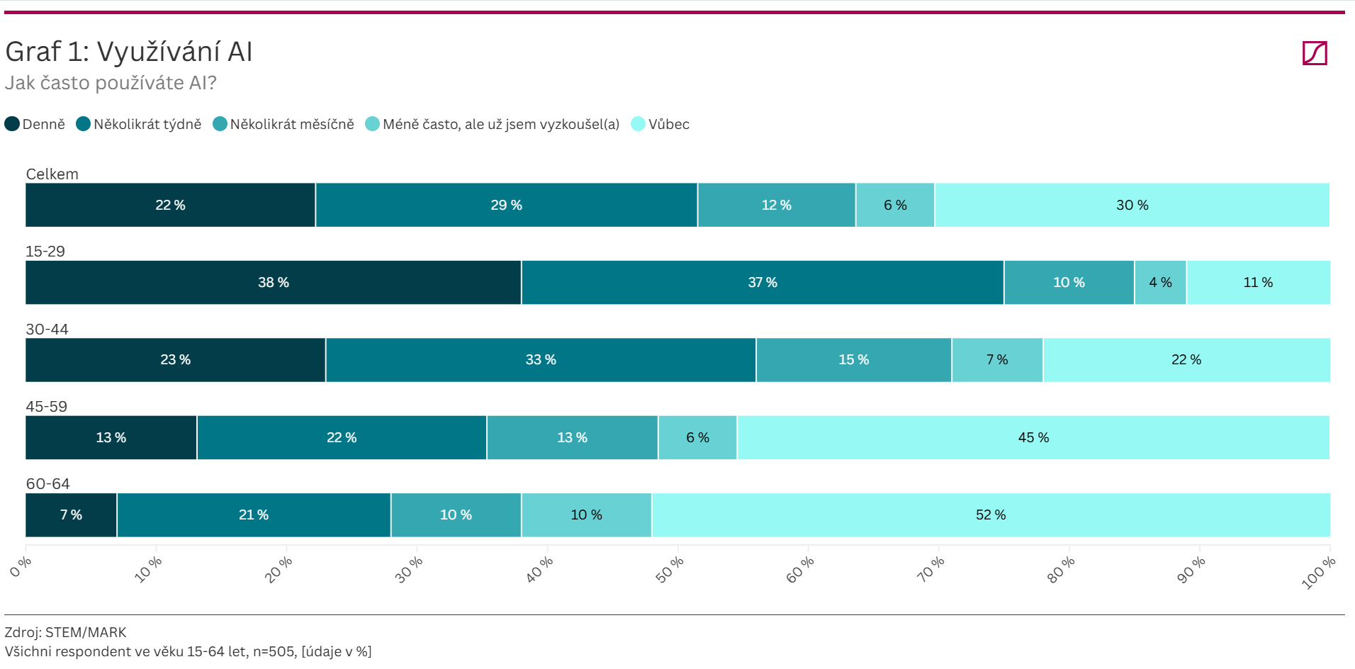 AI nástroje používají 3 ze 4 Čechů ve věku 15-64 let. Klíčovou roli hraje věk: mezi mladými do 29 let je využívá skoro každý (89 %), mezi 30–44letými většina (78 %). Naopak mezi lidmi nad 44 let má s AI zkušenost přibližně polovina. Důležité jsou i další faktory: častěji po AI nástrojích sahají lidé s VŠ vzděláním a vyššími příjmy, což zřejmě souvisí s charakterem vykonávané práce i zájmů, a lidé z Prahy, kde je vyšší podíl studentů a vedoucích pracovníků. Mladí do 29 let patří častěji ke každodenním uživatelům a AI se stala běžnou součástí jejich života. Lidé nad 29 let používají AI několikrát za týden.