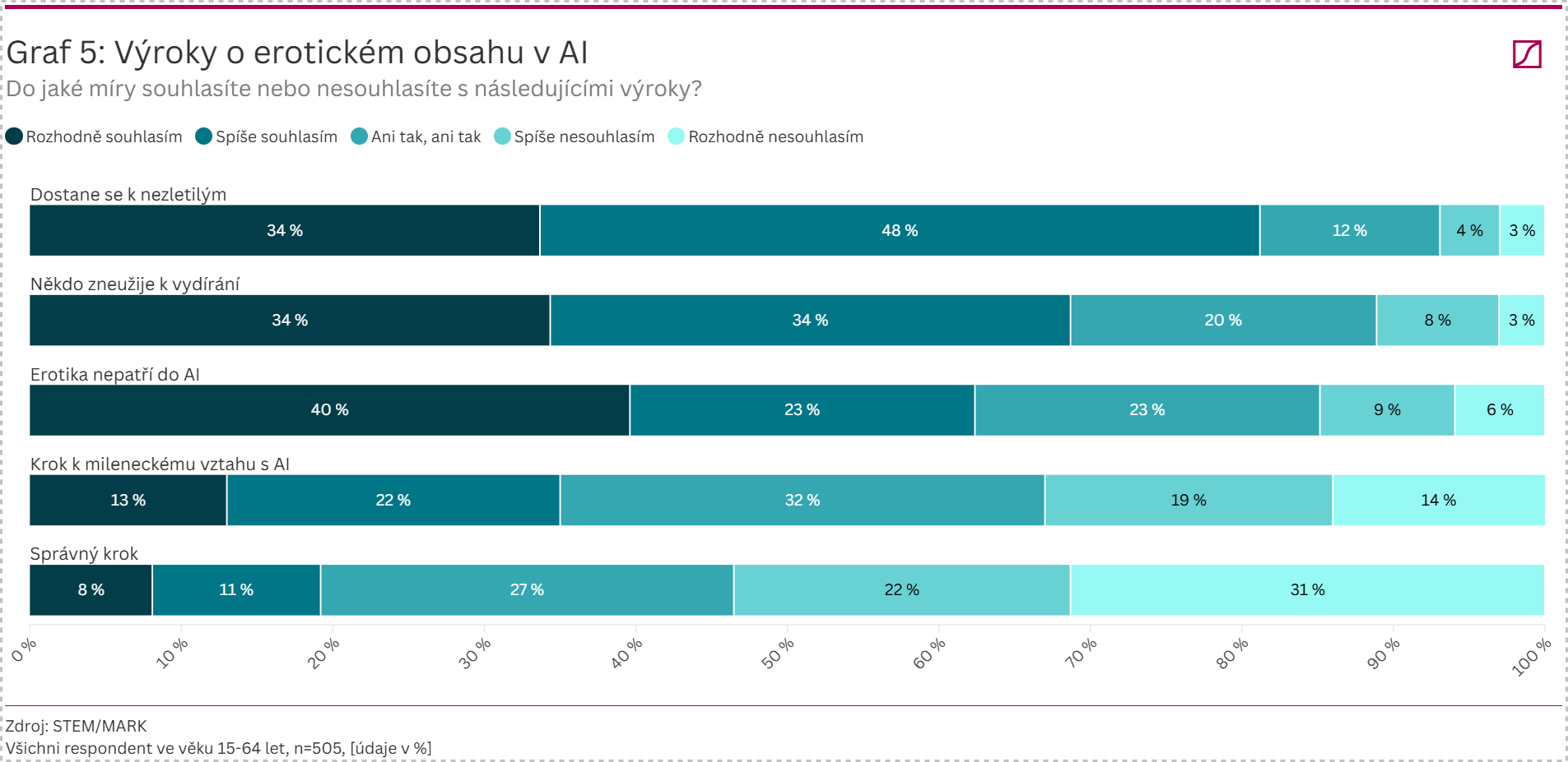 „Pokud AI odpovídá na dotazy o erotických tématech, vytváří textový erotický obsah nebo eroticky s uživatelem komunikuje, je to asi přijatelné. Vytváření erotických fotografií nebo videí, zvlášť s použitím reálných identit, už překračuje etické hranice,“ dodává Zuzana Švalbová z agentury STEM/MARK.