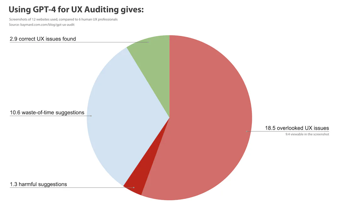 Na 12 testovaných webech ChatGPT v průměru správně identifikoval 2,9 problémů, ale zároveň přehlédl dalších 9,4 komplikací. Dále neidentifikoval 18,5 nedostatků, které pramenily z chybné interaktivity webu. To bychom mu ale s přimhouřením oka odpustili, protože neměl přístup k živému webu, aby si přítomnost chyb ověřil.