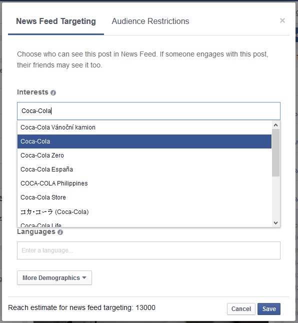 K základnímu demografickému a geografickému cílení nyní přibývá především možnost oslovit specifické skupiny dle jejich zájmů. Marketing Journal dnes například vydal komentář k nové kampani Coca-Coly nazvané Taste The Feeling. U takto velkého brandu by šlo cílit i na jeho příznivce.