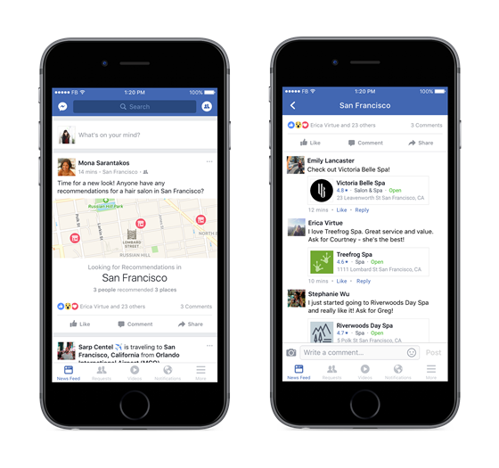 Začněme u Doporučení. Na své zdi často sdílíme momenty, které jsou spojeny s nějakým konkrétním místem či podnikem. Když cestujeme na nové místo nebo jen hledáme novou restauraci, často si necháváme od svých blízkých také poradit. Nyní bude u příspěvků na Facebooku možné zapnout nový nástroj, který pomůže s organizací doporučení od přátel přímo pod konkrétním postem. V komentářích se tak nebude zobrazovat pouze text, ale i odkaz na podnik, jeho hodnocení či adresa.