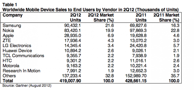 Analytická společnost Gartner zveřejnila údaje zachycující celosvětové prodeje mobilních telefonů v druhém kvartálu tohoto roku (Q2). Vítěz je nezpochybnitelný, je jím operační systém Android a více specificky Samsung. Růst prodejů iPhonu nyní neroste tak výrazně, protože jeho zákazníci čekají na nový model iPhone 5.