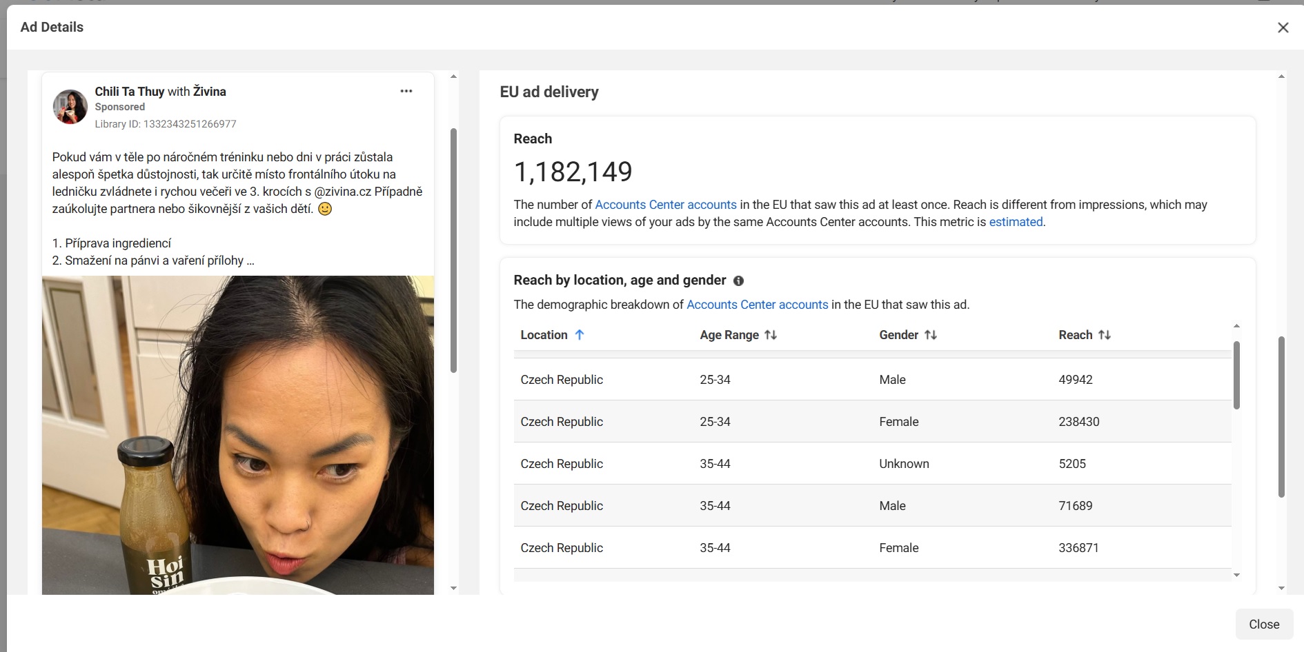 Na obrázku výše můžete vidět rozpad dosahu jedné z nejúspěšnějších reklam značky Živina. Je z ní patrné, že reklamu s populární influencerkou, publikovanou po její účasti v televizní soutěži StarDance, viděl de facto každý desátý člověk v Česku.