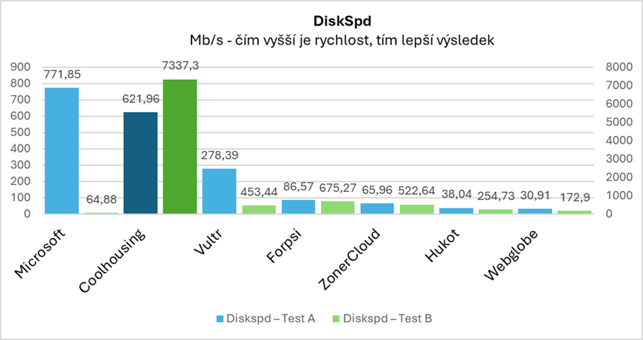 Graf: Výsledky srovnání rychlosti a výkonu úložišť v parametru DiskSpd (výkon diskového subsystému)