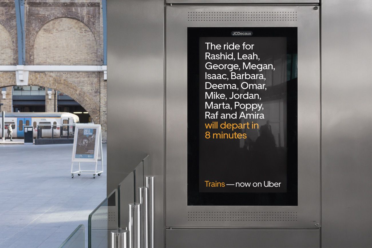 Ještě nápaditější kousky se ale najdou v zástupu verzí outdoorové reklamy s faktickým oznámením: „Trains—now on Uber.“ Třeba v případě skutečně XXXXXXXL billboardu umístěného nad drážními kolejemi.