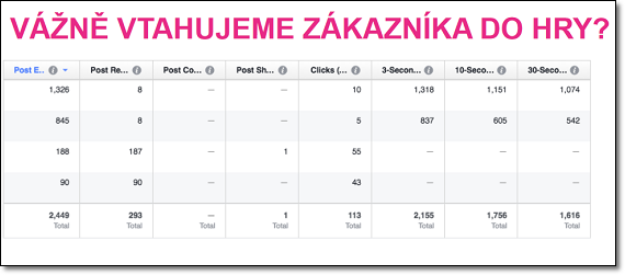 Jakub Křenek během své přednášky aktivně pracoval s publikem, a pravidelně se na něj obracel s žádosti o reakci na konkrétní výsledky měření. Své vědomosti si můžete ověřit i vy. Na obrázku níže vidíte engagement několika reklamních sad, nejvyšší je číslo 1 326 a nejnižší je číslo 90. Příspěvek s počtem 1 326 má ale ve skutečnosti jen 8 reakcí. Věděli byste z jakého důvodu?