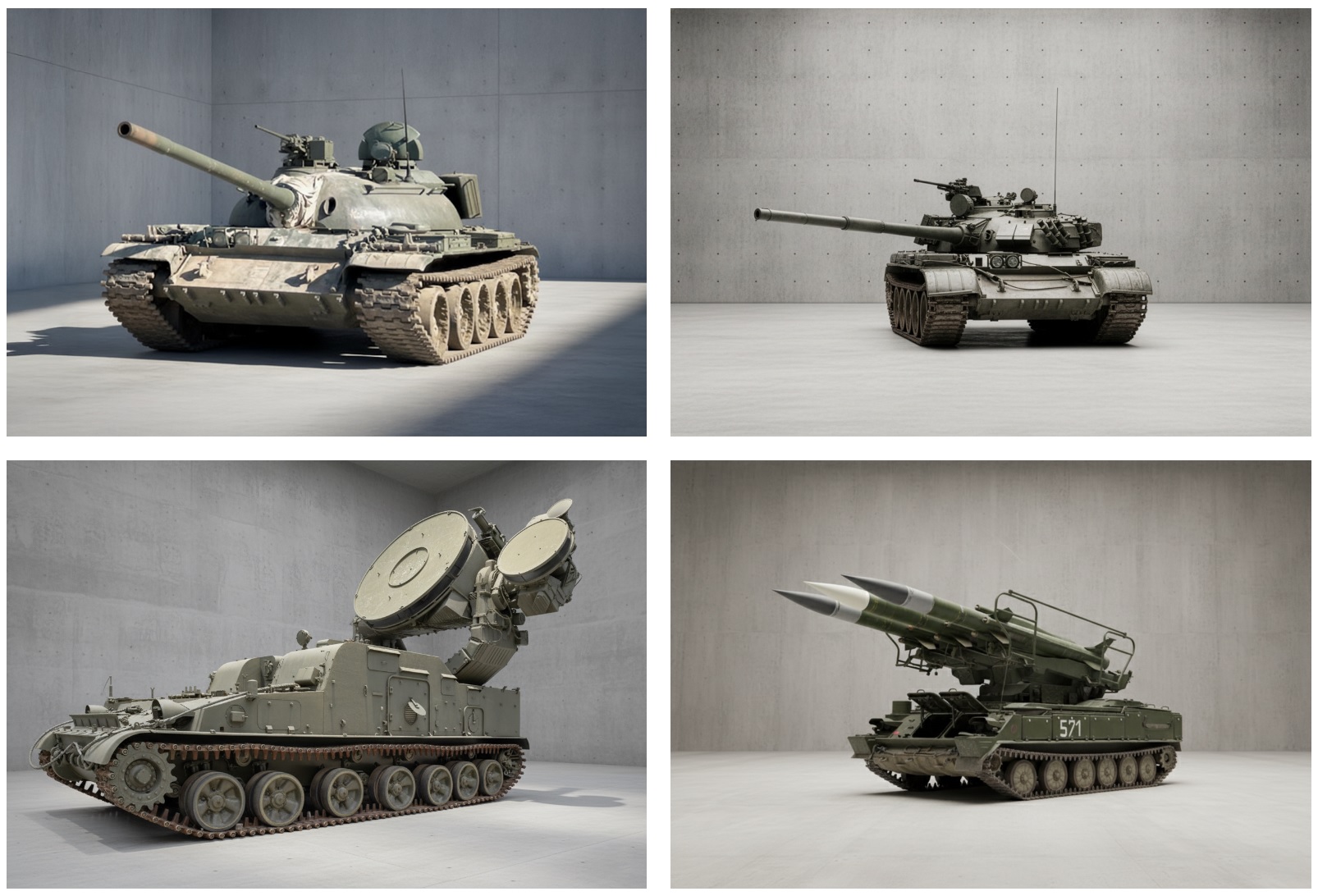 Zdrojové fotky vypadají třeba takhle: vezmu náhodný obrázek z natáčení, kde jsme dělali nějaké protiraketové systémy, a řeknu: ‚A teď mi ten protiraketový systém dej do studia, na betonové pozadí, v měkkém světle.‘ Hotovo.