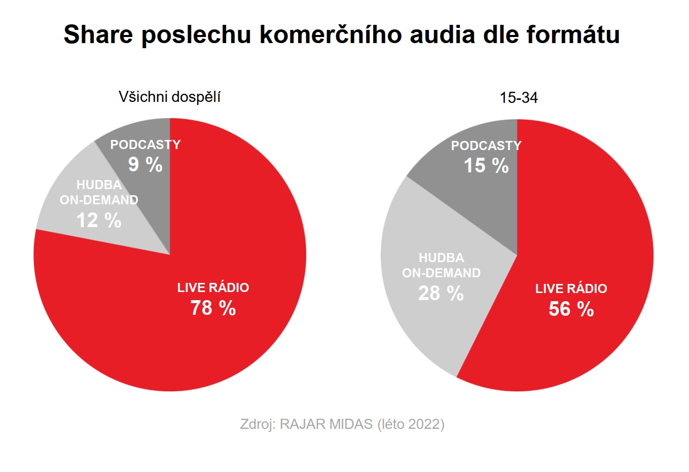 Expres FM přitom potřeboval komunikovat i to, proč je atraktivní jeho hlavní produkt v podobě živého vysílání. Obzvláště pak k mladé cílové skupině, která se — jak naznačuje i následující infografika — od něj ve větší míře odvrací k hudbě i podcastům „on demand“.